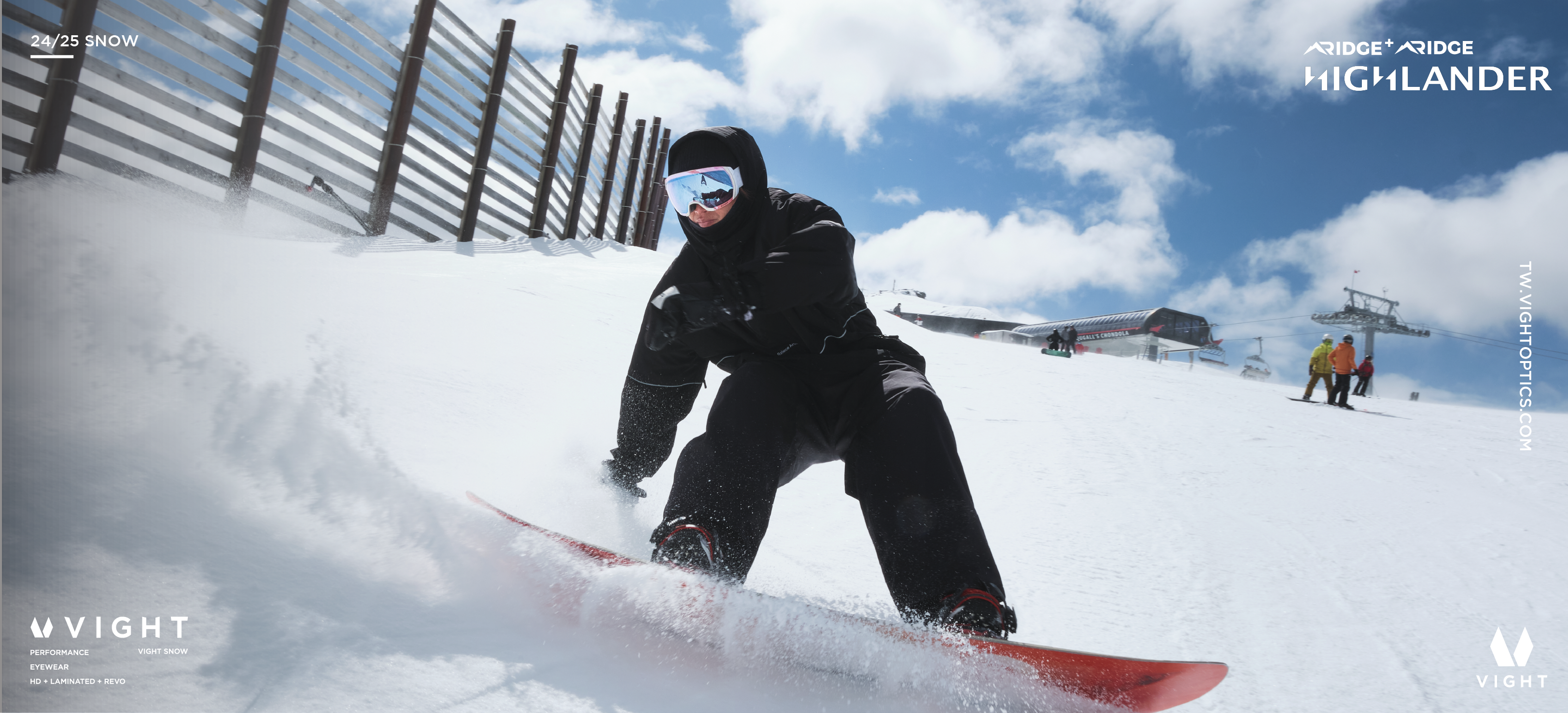 HIGHLANDER為市售最大可視範圍非球面雪鏡, 提供滑行者絕佳的視覺空間,無視線死角, 讓滑行路線判斷更為快速與精準,雙框色設計凸 顯個人風格,搭配服裝更有層次與多元化, 45mm 寬織帶設計配戴於安全帽上更為穩固。